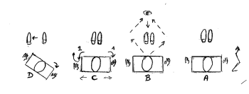 - L’Ouverture Redresser le corps en partant des jambes, puis le hanches, ensuite dos et épaules, finir avec la tête (A) Elargir le champ de vision sur les cotés, puis fixer le plus loin vers l’avant et revenir à la vision normale (B) Faire partir les épaules légèrement latéralement de gauche a droite, puis légère rotation des épaules (C) Déplacer le pied gauche, en vrillant en même temps le coté droit du corps, vers l’arrière (D)