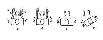 ……………………………………………………………………………… Vriller le corps dans l’autre sens (E) puis revenir de face (F) Redresser le corps comme A , en levant les bras devant ( mains relâchées vers le bas) (G) Plier les genoux, baisser légèrement le coude gauche, puis le droit, stabiliser sa posture s’agripper avec les pieds et les mains (H)